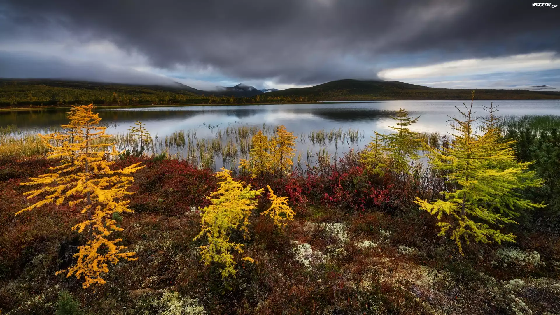 Rosja, Kołyma, Góry, Jezioro, Jacka Londona, Jesień, Chmury, Drzewa, Roślinność