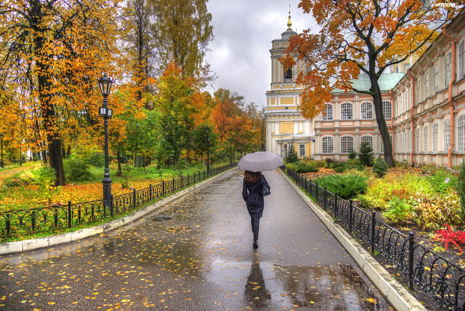 Rosja, Petersburg, Ławra Aleksandra Newskiego w Petersburgu, Klasztor, Jesień, Kobieta, Parasol, Park, Alejka, Drzewa, Liście |