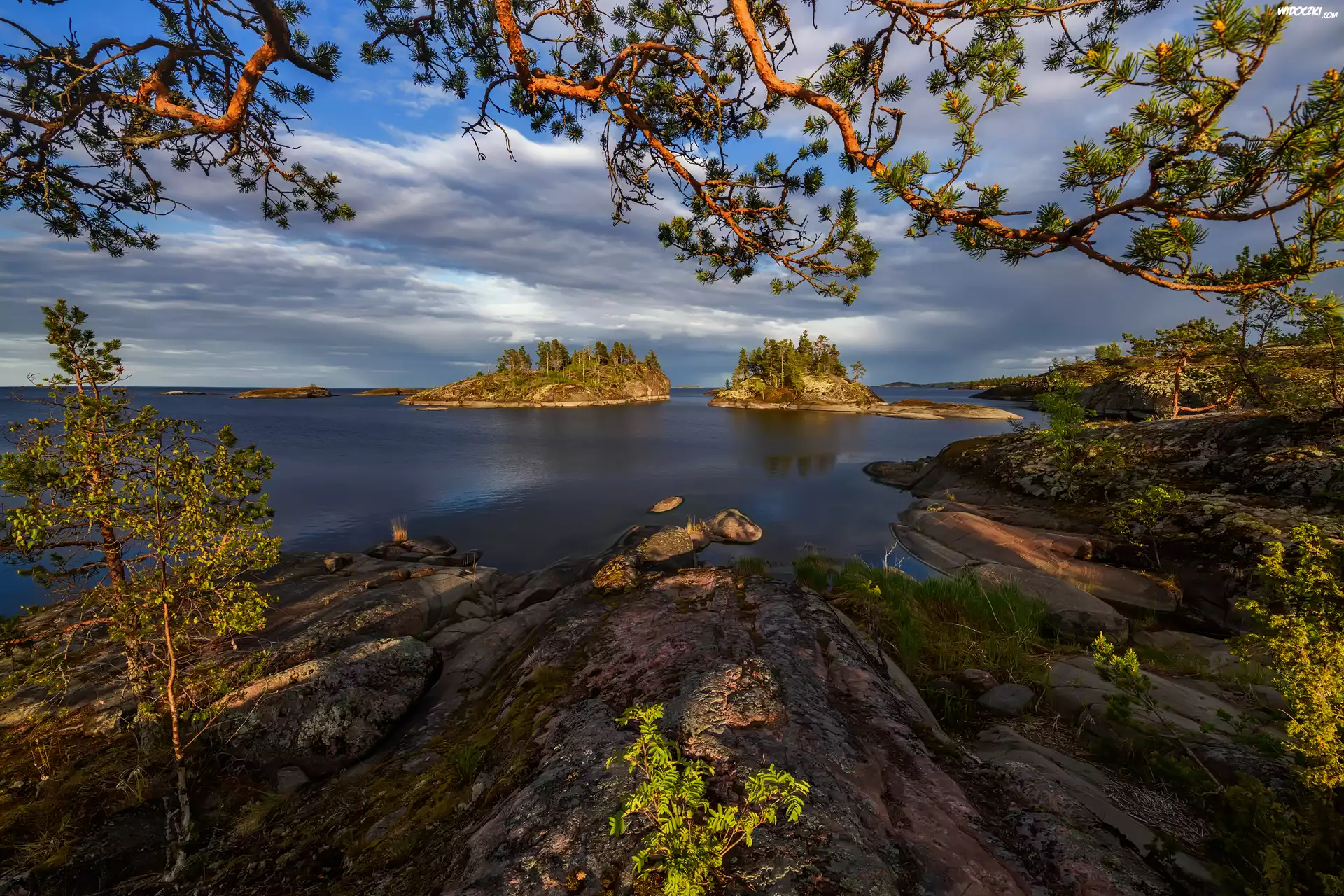 Zdjęcia, Rosja, Karelia, Jezioro, Ładoga, Wyspy, Wysepki, Drzewa, Gałęzie, Skały