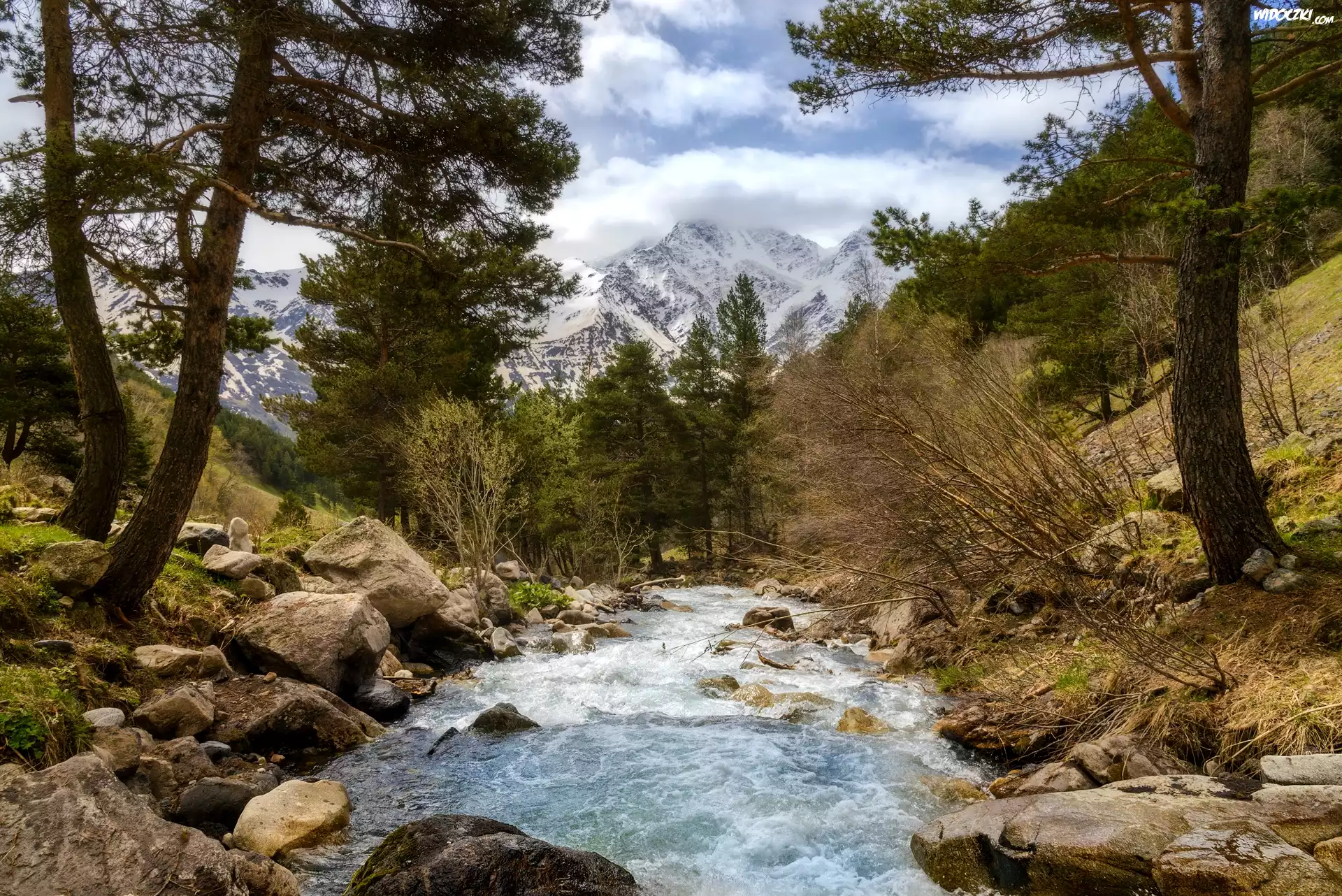 Zdjęcia, Drzewa, Rzeka Baksansky, Kamienie, Góry, Wąwóz Terskol, Kabardo-Bałkaria, Rosja