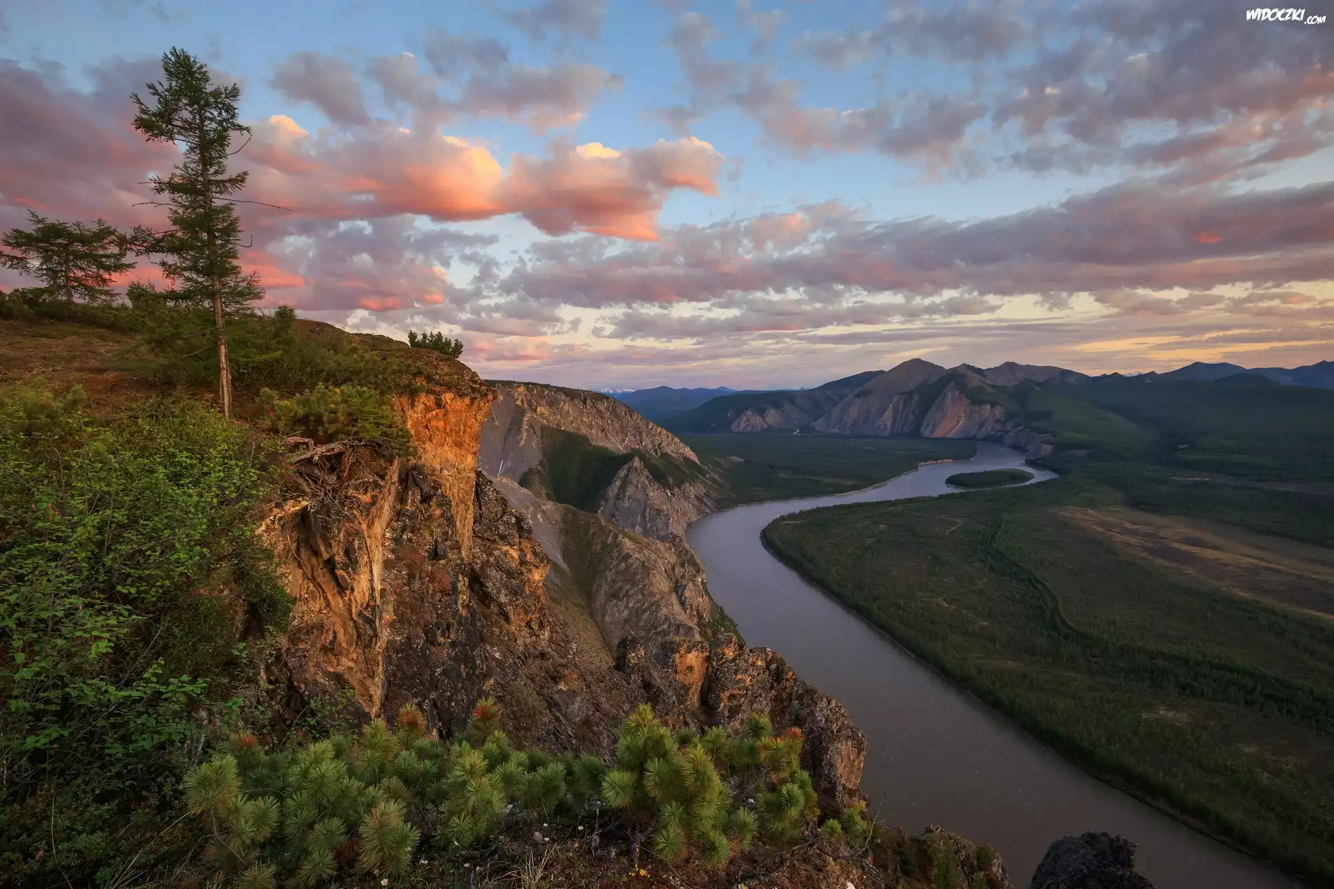 Zdjęcia, Rzeka Indygirka, Góry, Skały, Drzewa, Jakucja, Republika Sacha, Rosja