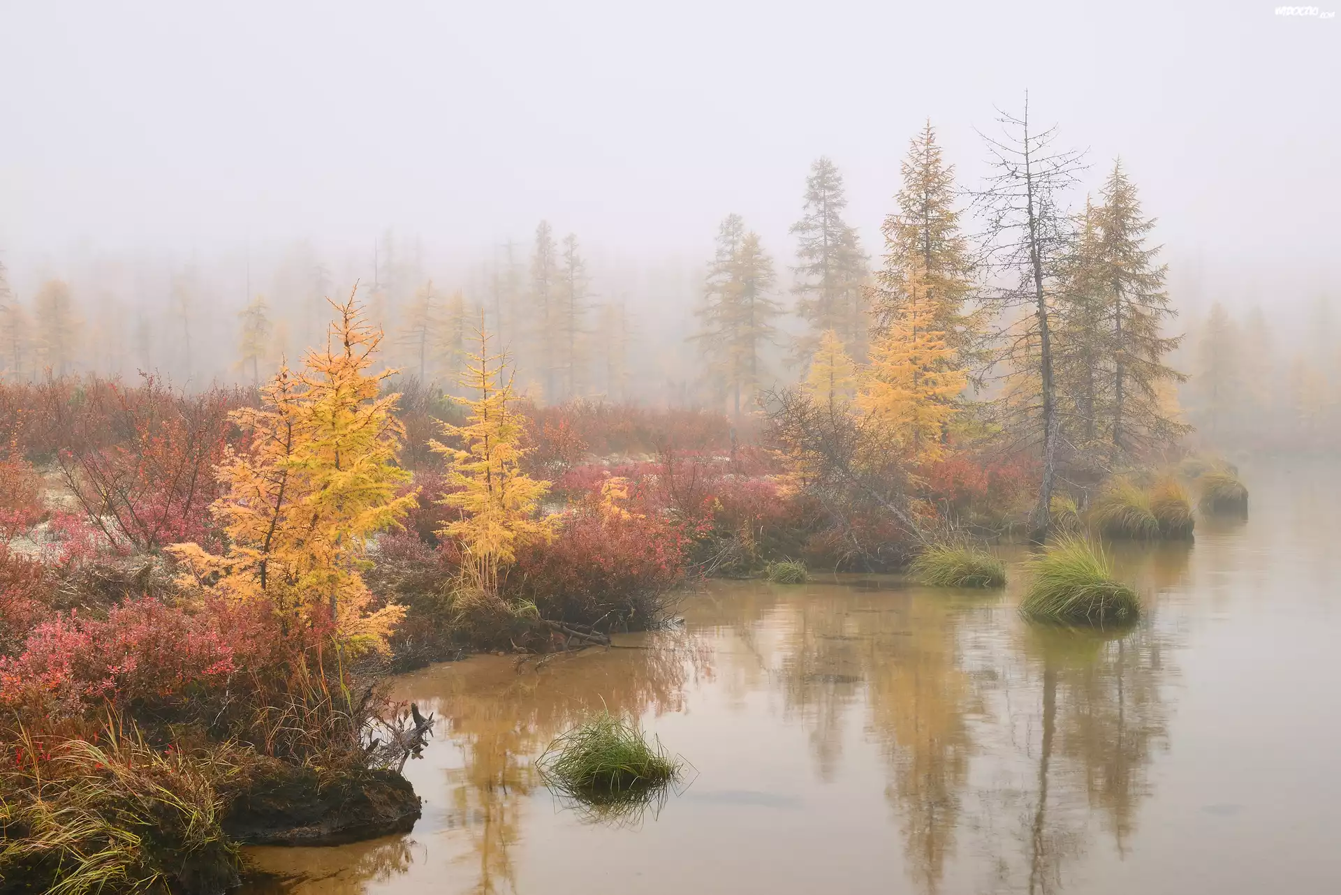 Jesień, Mgła, Drzewa, Jezioro Jack London, Kołyma, Obwód magadański, Rosja