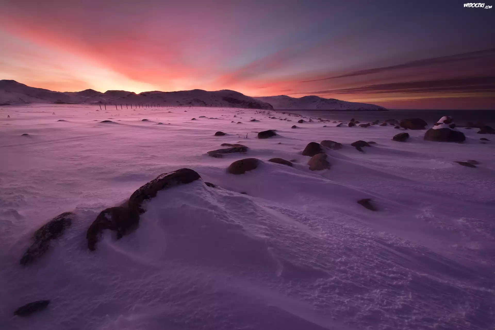 Zima, Góry, Kamienie, Zachód słońca, Teriberka, Obwód murmański, Rosja