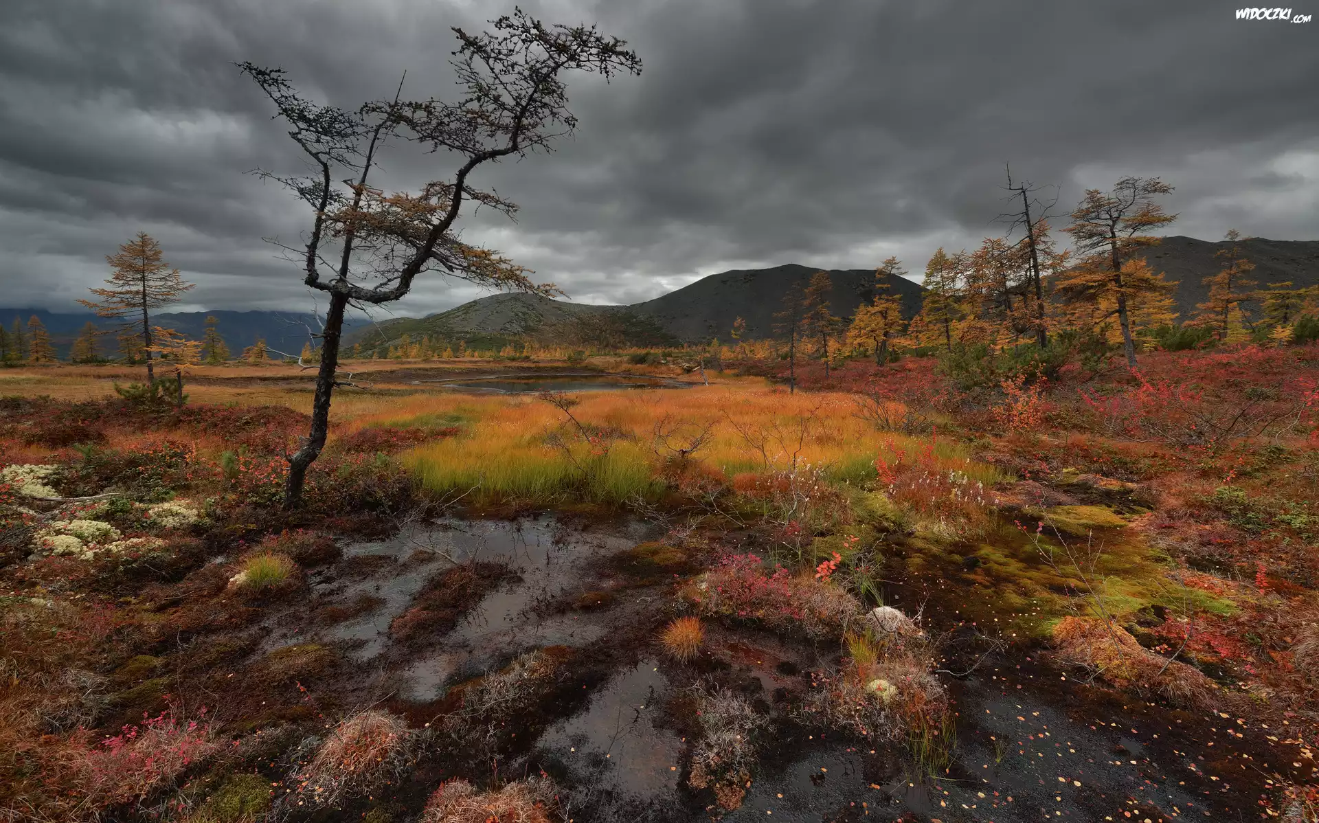 Kołyma, Jesień, Drzewa, Góry Kołymskie, Kamienie, Trawy, Obwód magadański, Rosja