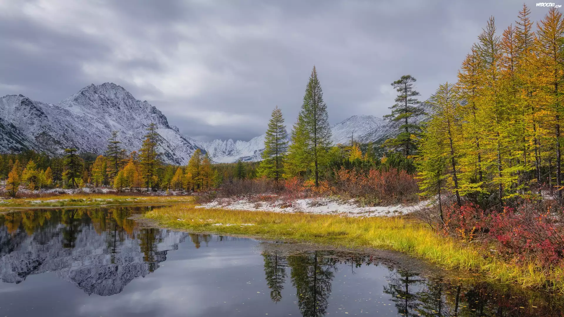Zdjęcia, Rosja, Kołyma, Jesień, Rzeka, Potok Nieznany, Ośnieżone, Góry Kołymskie, Drzewa