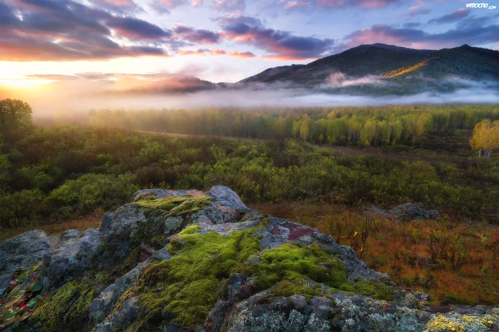 Góry Ałtaj, Lasy, Mgła, Wschód słońca, Kraj Ałtajski, Rosja