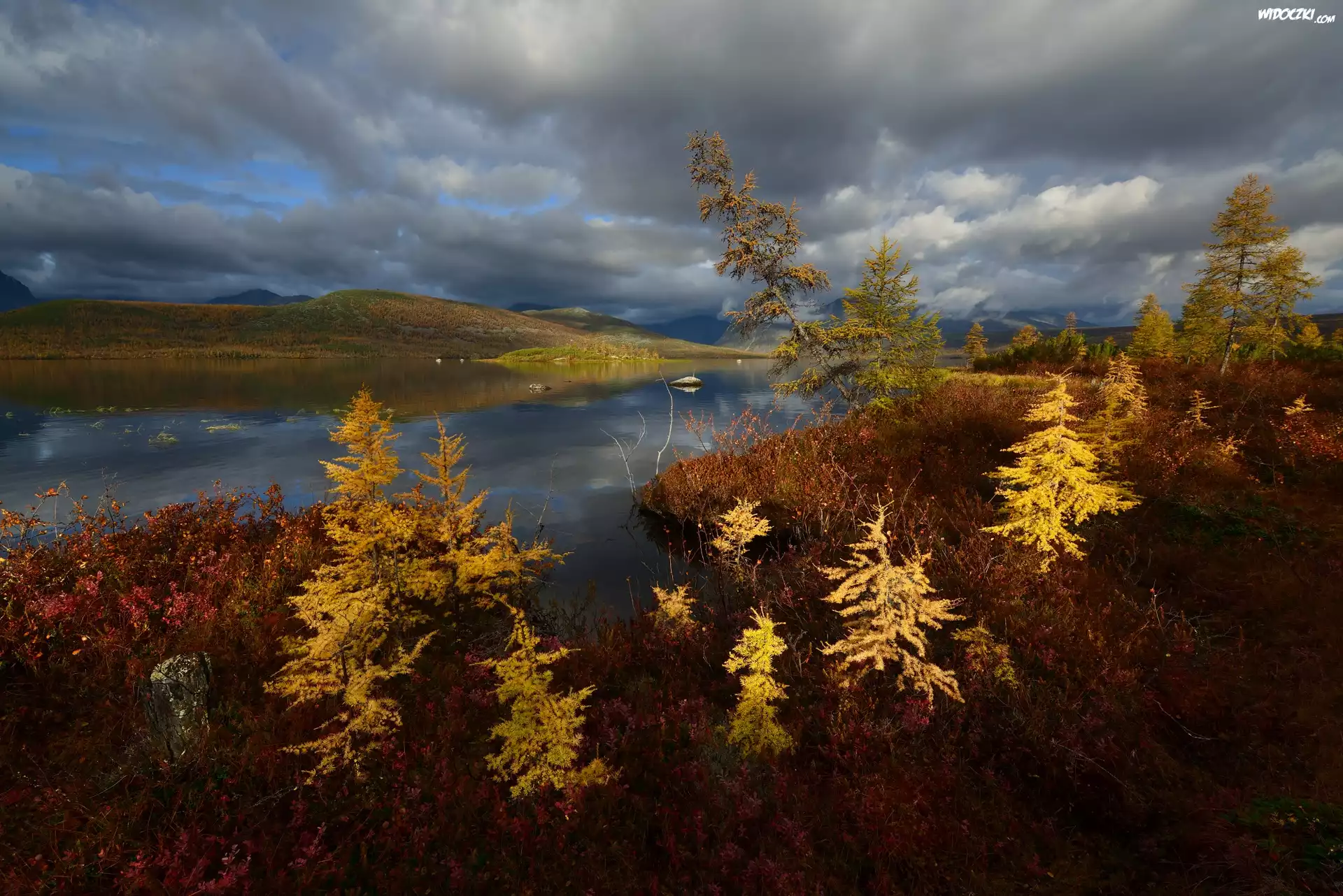 Jesień, Drzewa, Jezioro Jack London, Góry, Kołyma, Obwód magadański, Rosja