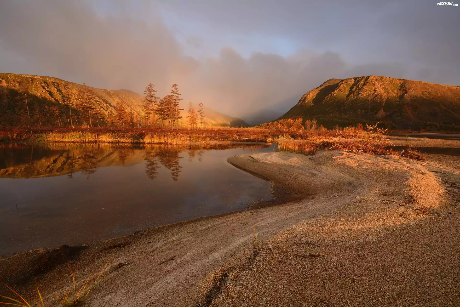 Zdjęcia, Góry, Rzeka Purga, Drzewa, Mgła, Jesień, Kołyma, Obwód magadański, Rosja