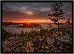 Rosja, Karelia, Jezioro, Ładoga, Skały, Drzewa, Niebo, Zachód słońca
