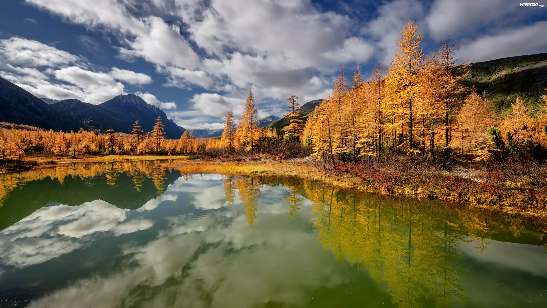 Rosja, Kołyma, Jezioro, Jacka Londona, Jesień, Drzewa, Góry, Odbicie, Chmury