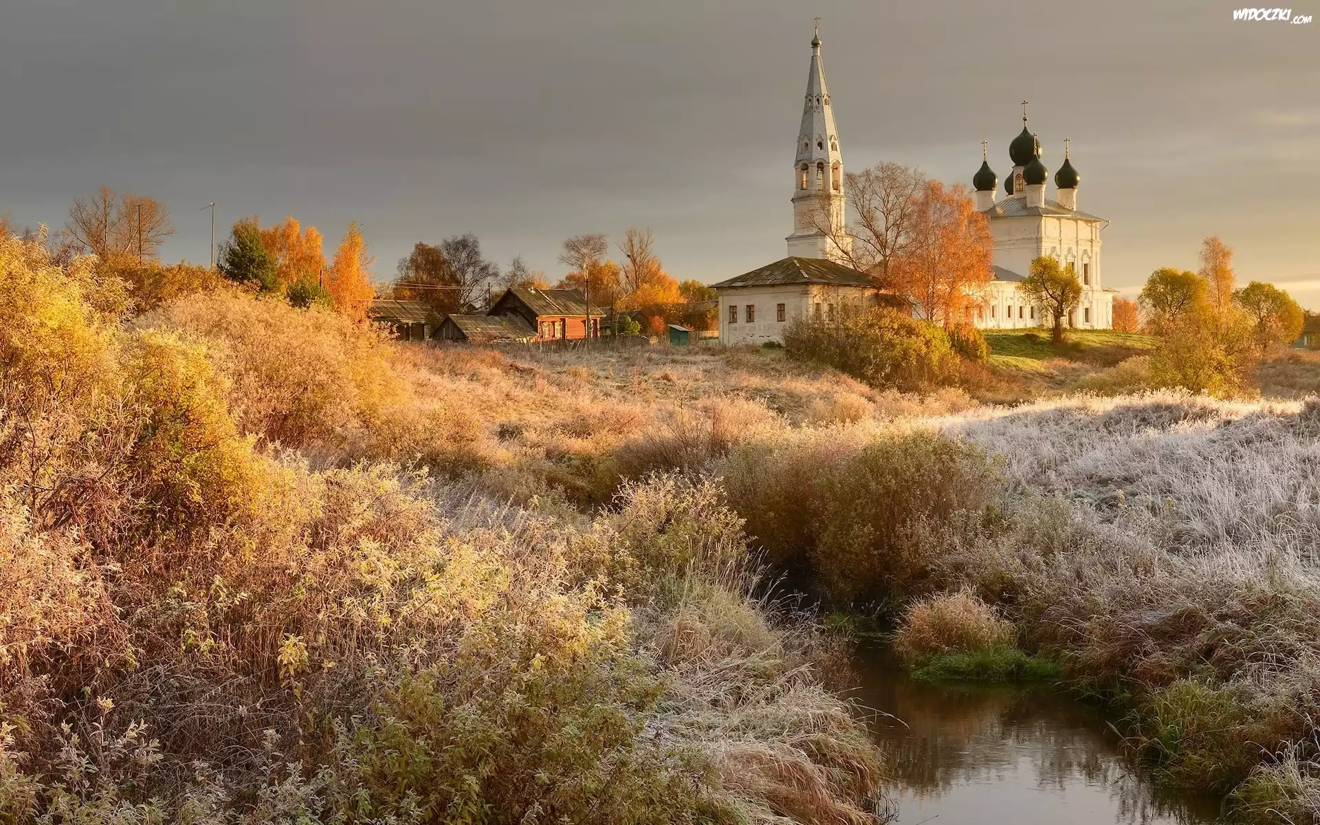 Cerkiew, Drzewa, Rzeka Lakhost, Oszroniona, Trawa, Osenevo, Obwód jarosławski, Rosja