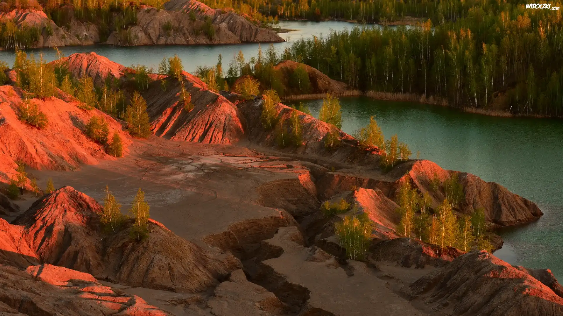 Zdjęcia, Jezioro, Skały, Drzewa, Kamieniołomy, Pagórki, Wieś Konduki, Obwód tulski, Rosja