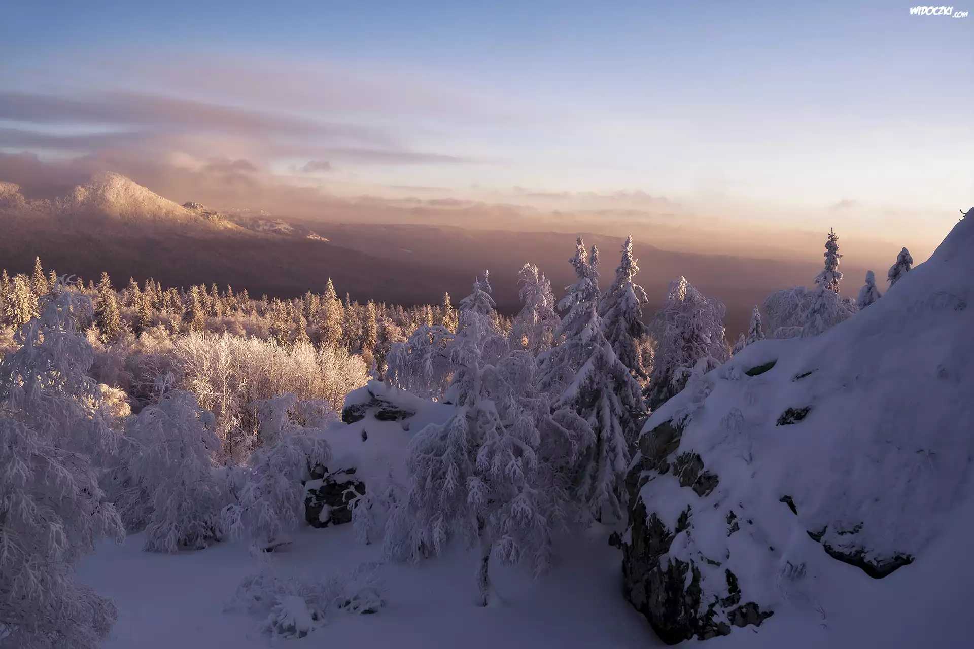 Zdjęcia, Góry, Skały, Drzewa, Zima, Park Narodowy Taganaj, Obwód czelabiński, Rosja