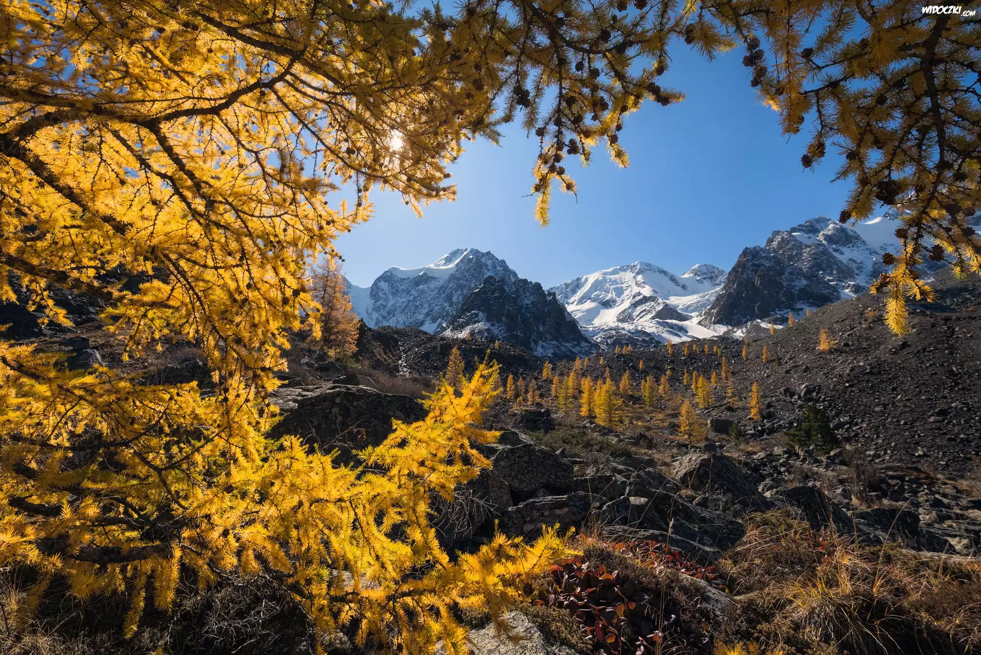 Jesień, Góry Północnoczujskie, Ałtaj, Drzewa, Gałęzie, Republika Ałtaju, Rosja