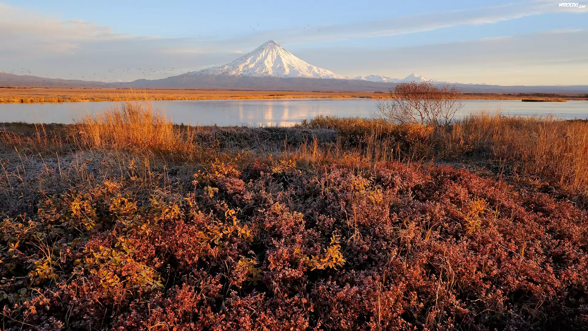 Rosja, Kamczatka, Kronocki Rezerwat Biosfery, Jezioro Kronockie, Góra, Stratowulkan Kronocka Sopka, Jesień, Trawy |