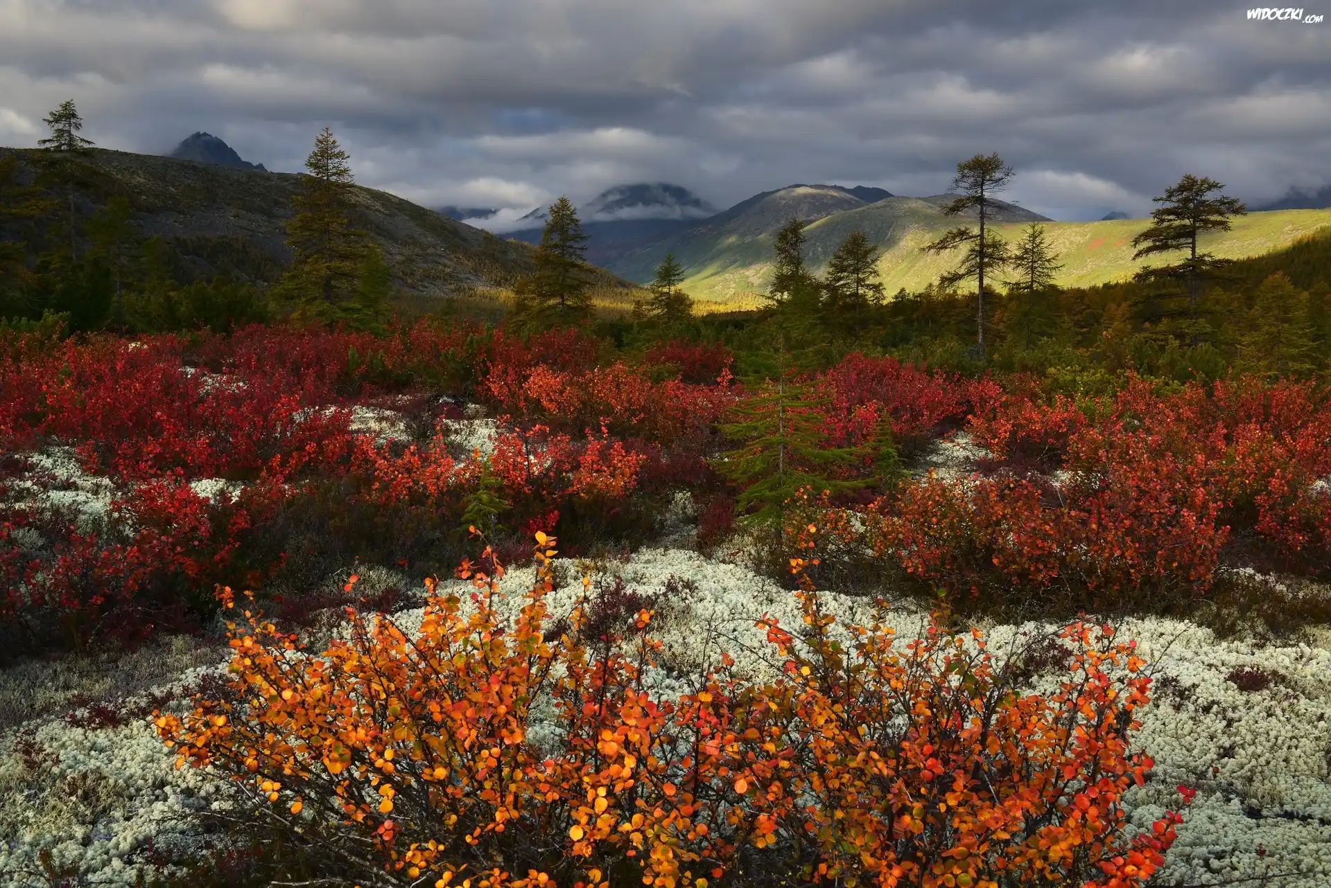 Zdjęcia, Góry Kołymskie, Drzewa, Krzewy, Rośliny, Chmury, Kołyma, Obwód magadański, Rosja