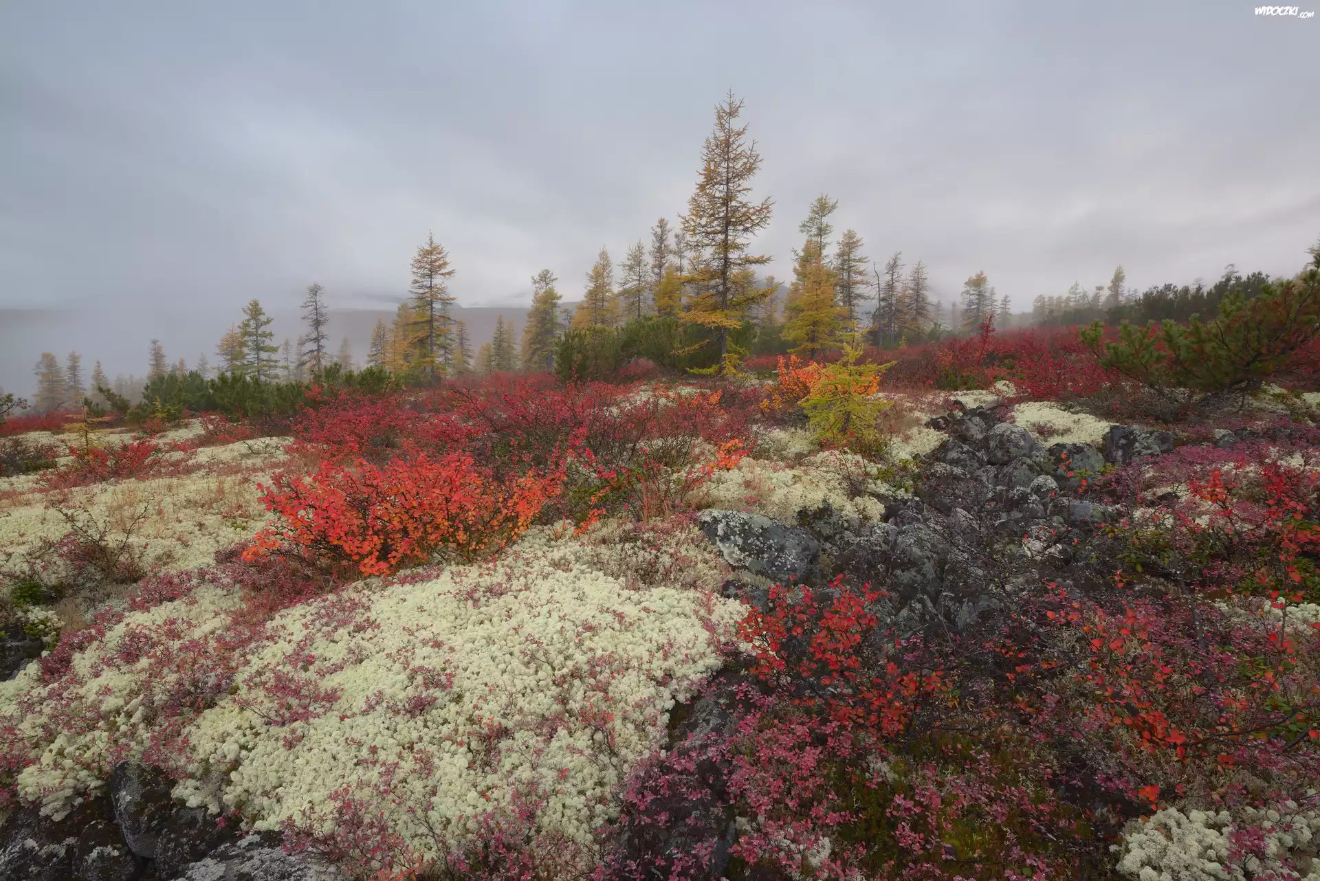 Drzewa, Kolorowe, Rośliny, Wzgórza, Mgła, Kołyma, Obwód magadański, Rosja