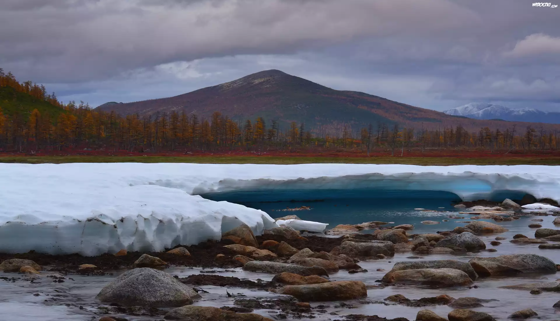 Zdjęcia, Zima, Góra, Drzewa, Kamienie, Rzeka Purga, Kołyma, Obwód magadański, Rosja