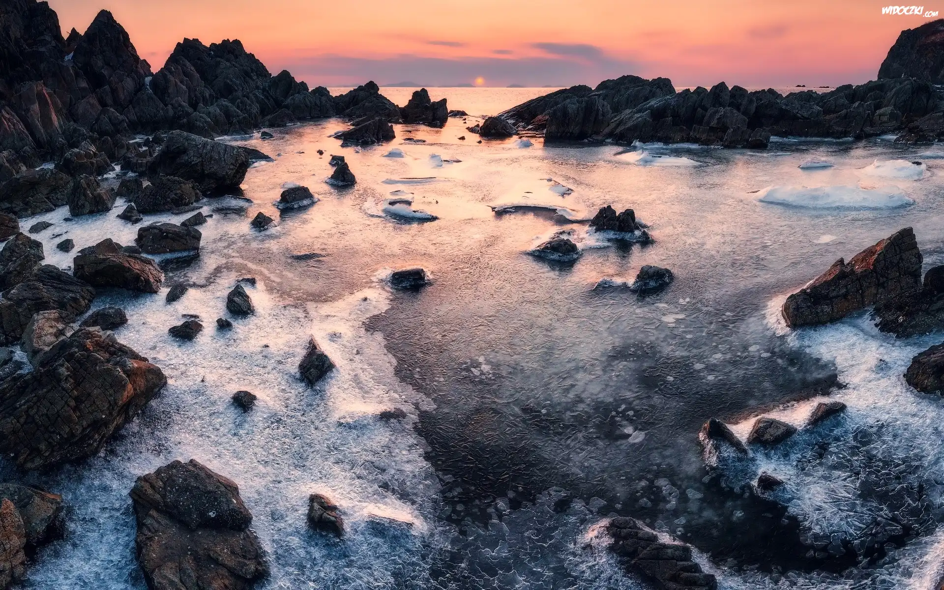 Morze Japońskie, Brzeg, Lód, Skały, Wschód słońca, Kraj Nadmorski, Rosja