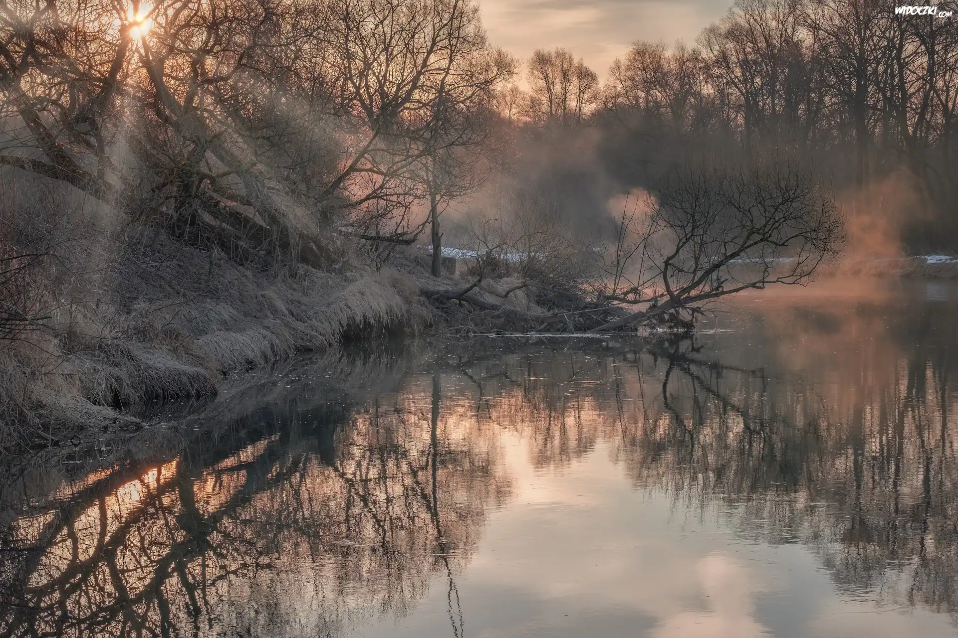 Rzeka Istra, Drzewa, Promienie słońca, Mgła, Odbicie, Obwód moskiewski, Rosja