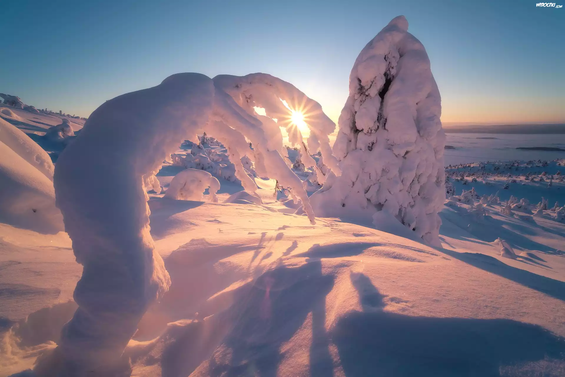 Zima, Ośnieżone, Drzewa, Promienie słońca, Zatoka Kandałaksza, Półwysep Kolski, Rosja