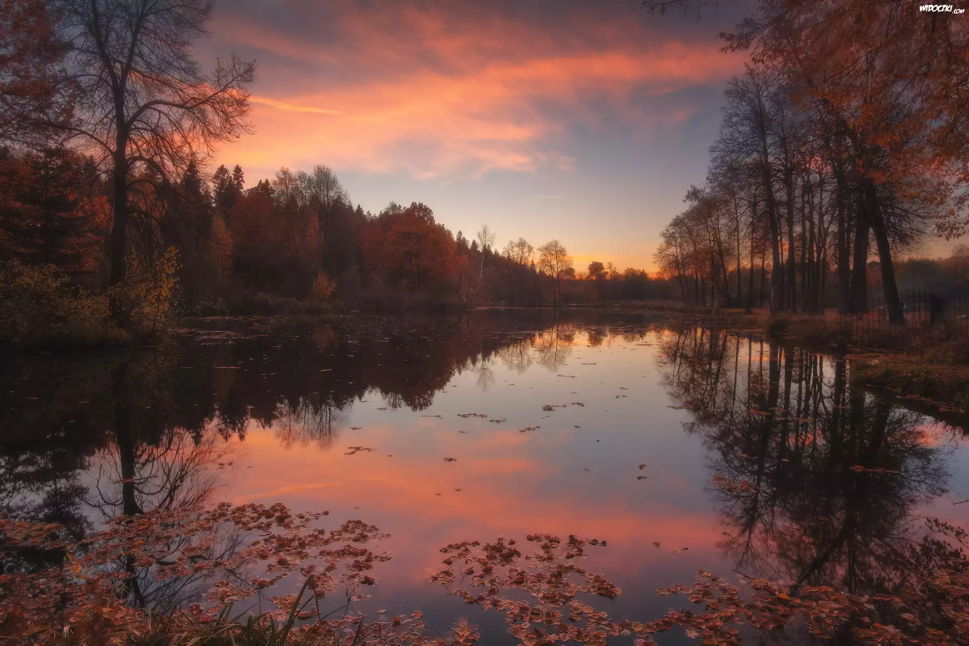 Drzewa, Zachód słońca, Staw Barski, Serednikowo, Obwód moskiewski, Rosja