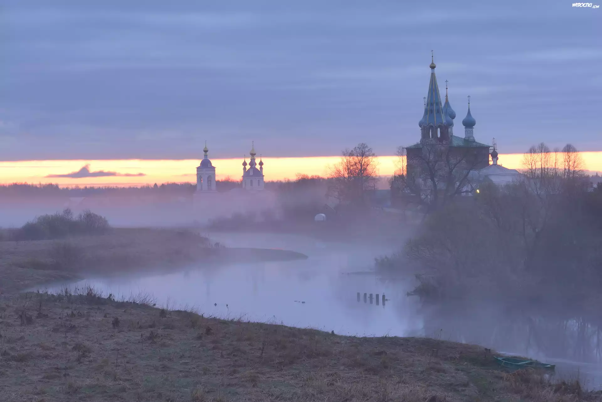 Rzeka Teza, Cerkiew, Mgła, Świt, Drzewa, Dunilovo, Obwód iwanowski, Rosja
