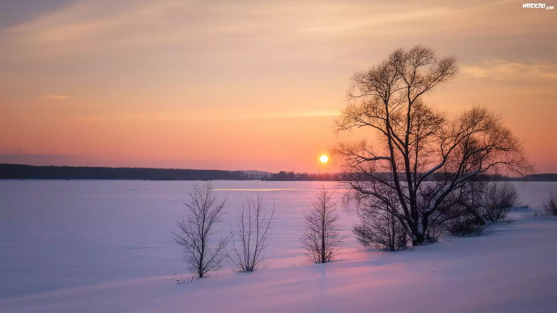 Zima, Rzeka Wołga, Drzewa, Zachód słońca, Miejscowość Kostroma, Rosja