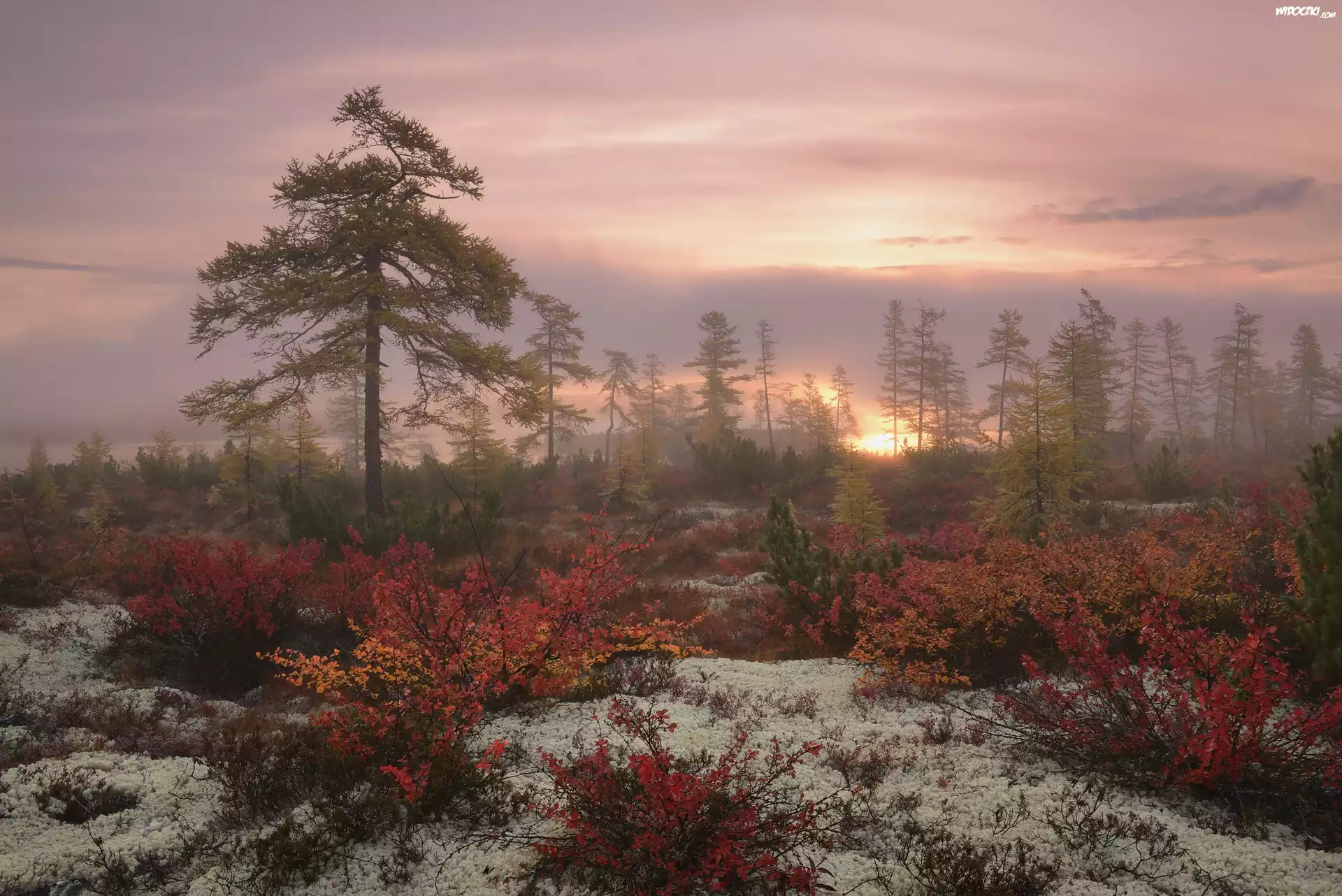 Jesień, Drzewa, Wschód słońca, Mgła, Kołyma, Obwód magadański, Rosja