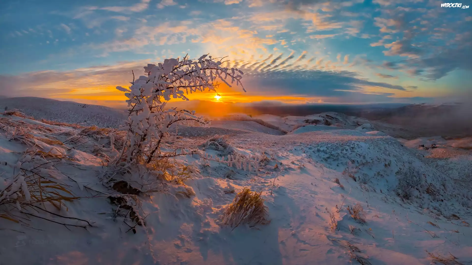Zima, Wierzchołek, Góra Strizhament, Wzgórza, Ośnieżona, Roślinność, Zachód słońca, Rosja |