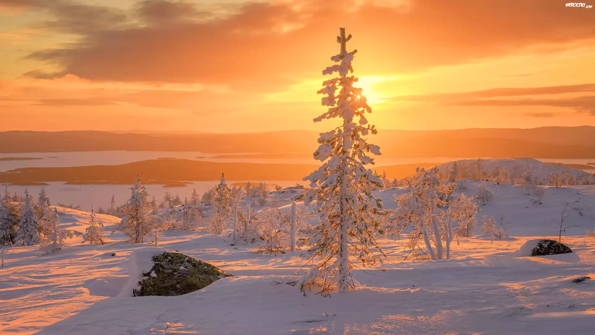 Rosja, Półwysep Kolski, Zima, Ośnieżone, Drzewa, Zachód słońca, Kamienie