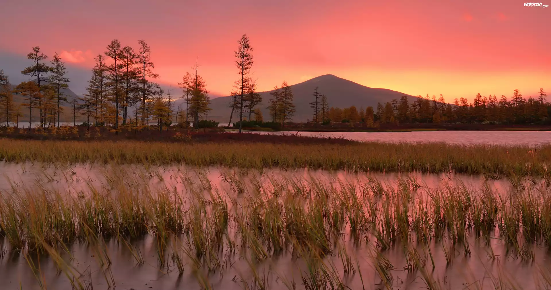 Góry, Jezioro, Trawy, Drzewa, Zachód słońca, Kołyma, Obwód magadański, Rosja