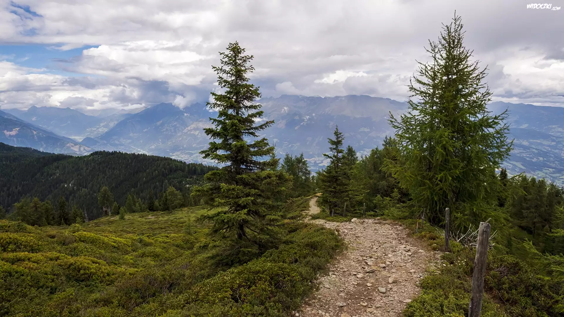 Góry Himalaje, Lasy, Ścieżka, Świerki, Roślinność, Chmury, Miejscowość Śrinagar, Stan Uttarakhand, Indie |