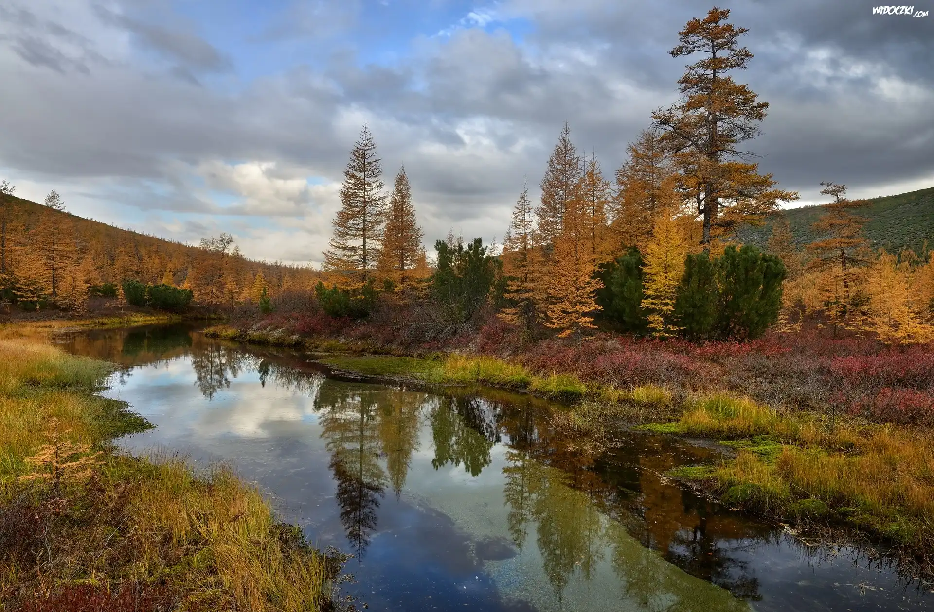 Rosja, Obwód magadański, Jesień, Góry, Drzewa, Rzeka Kołyma, Roślinność