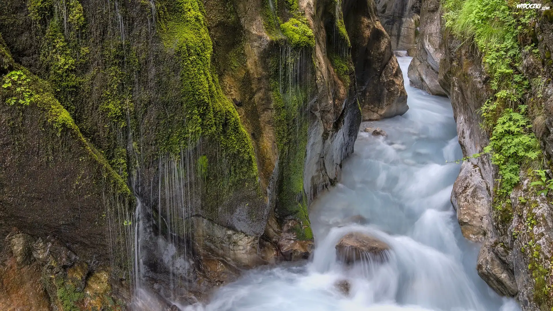 Zdjęcia, Niemcy, Bawaria, Rzeka, Wąwóz, Wimbachklamm, Skały, Mech, Roślinność