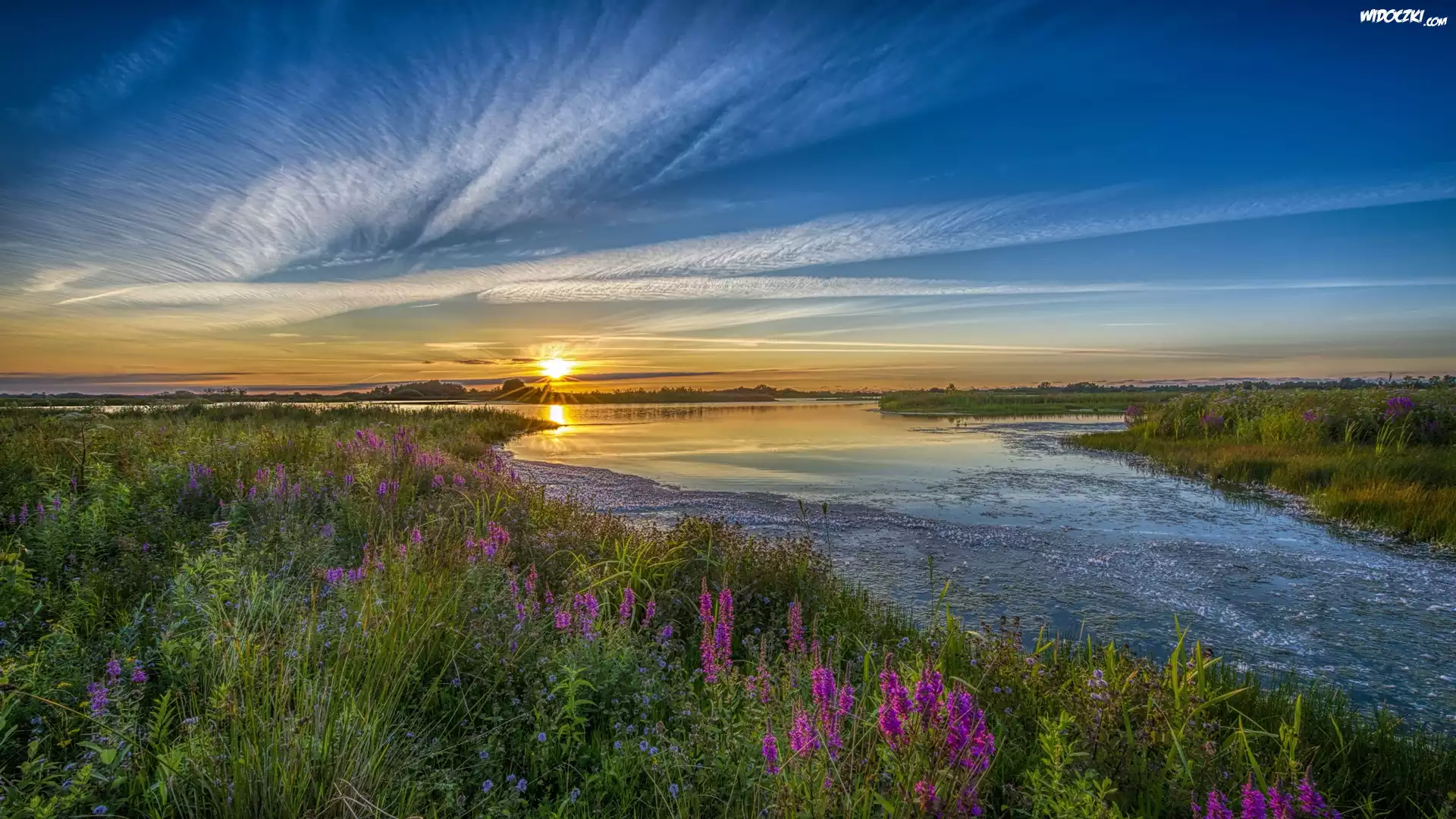 Rzeka, Roślinność, Wschód słońca, Chmury, Łąka, Kwiaty