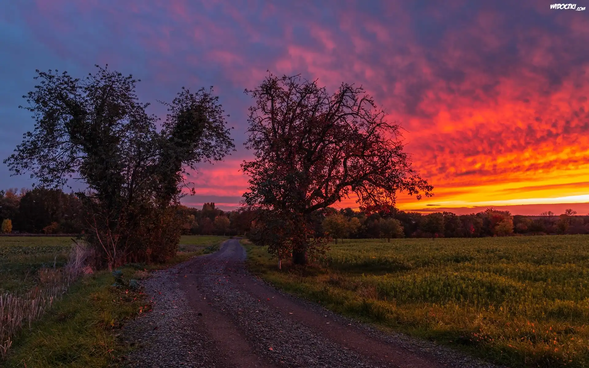 Zdjęcia, Droga, Pole, Drzewa, Roślinność, Zachód słońca