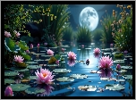 Staw, Lilie wodne, Rośliny, Księżyc, AI
