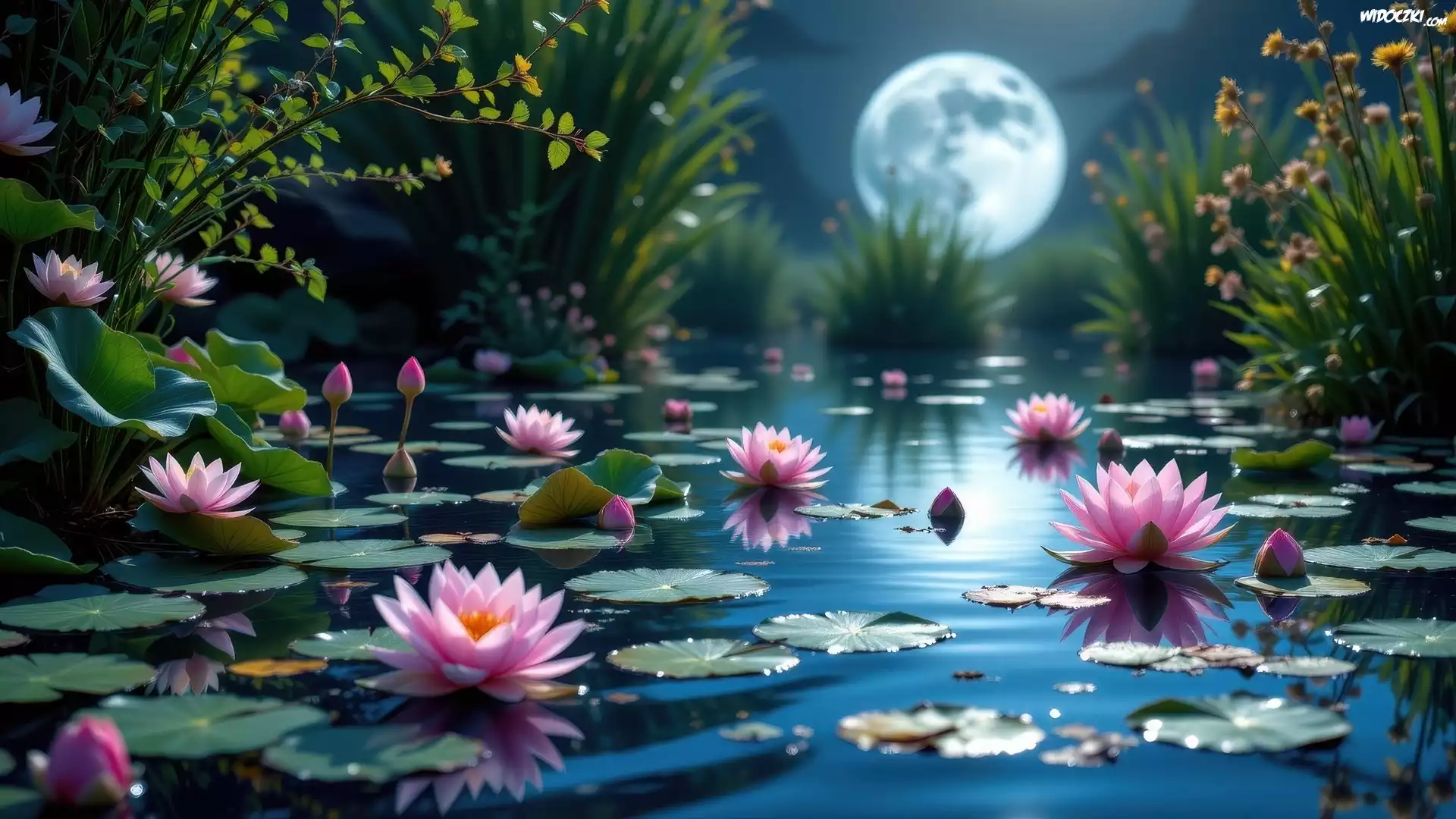 Zdjęcia, Staw, Lilie wodne, Rośliny, Księżyc, AI