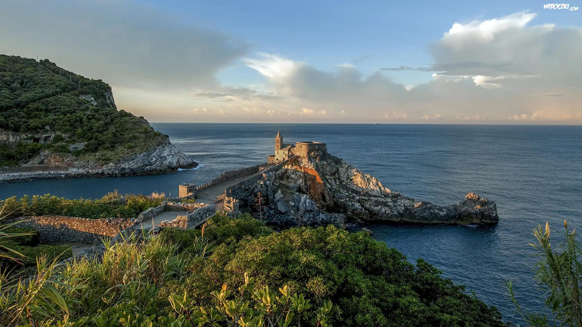 Włochy, Liguria, Wybrzeże, Rośliny, Morze, Poranek, Portovenere, Kościół, Chiesa di San Pietro, Skały |