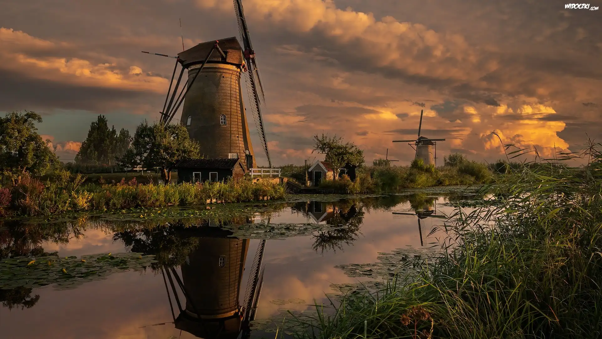 Wiatraki, Rzeka, Kanał, Rośliny, Kinderdijk, Holandia