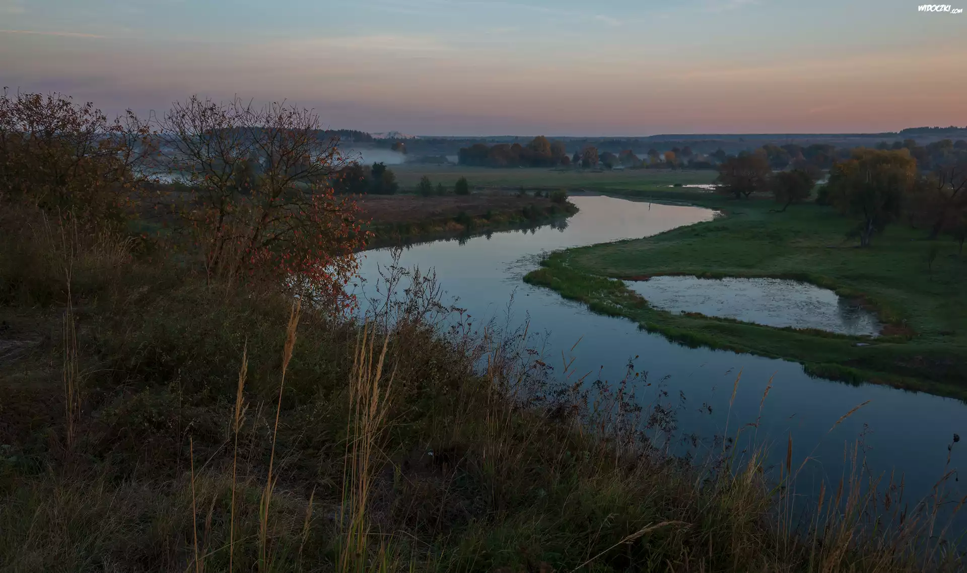 Rzeka, Rośliny, Trawa, Łąki, Drzewa, Wschód słońca, Mgła
