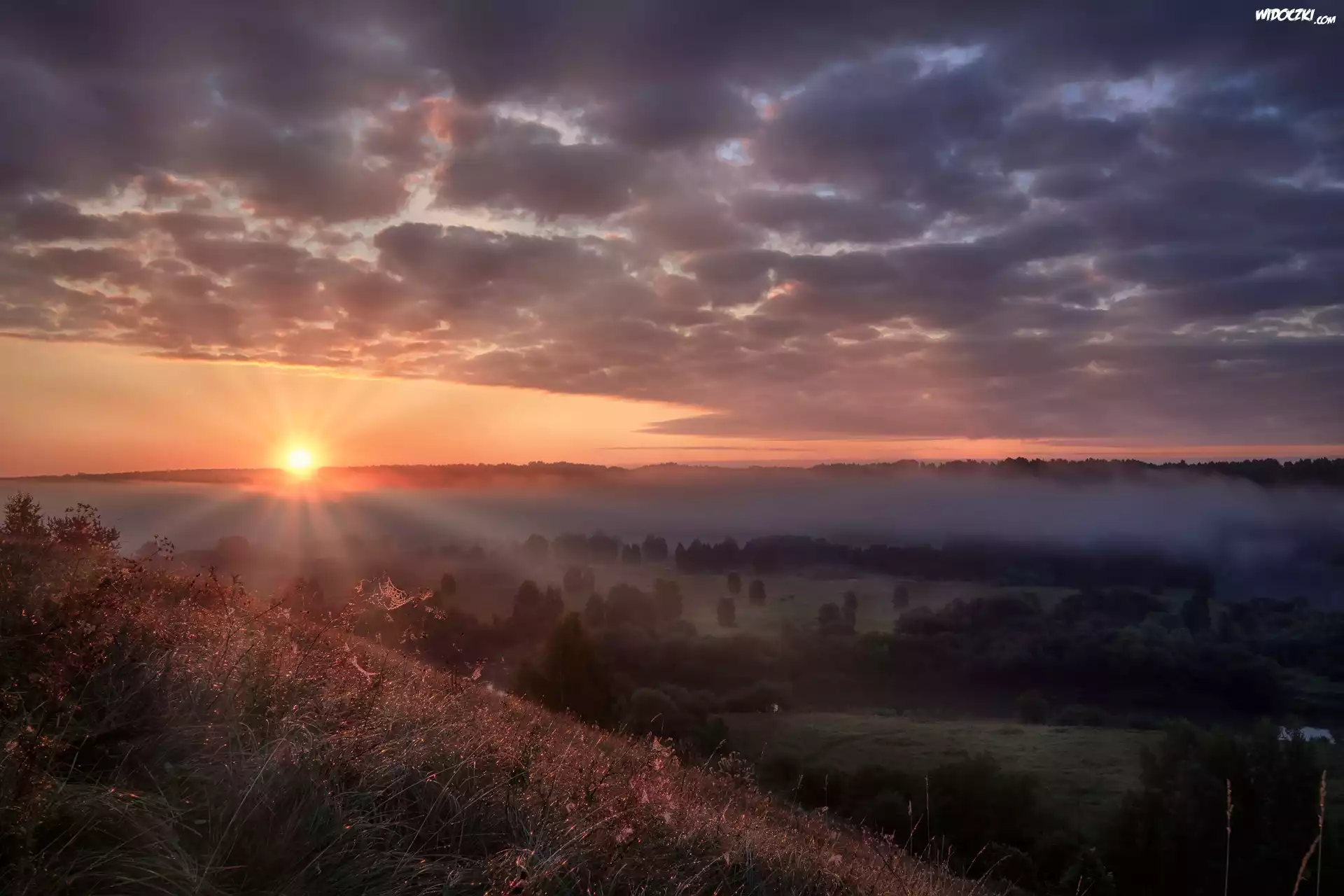 Wzgórza, Drzewa, Rośliny, Chmury, Mgła, Promienie słońca, Sylva, Kraj Permski, Rosja