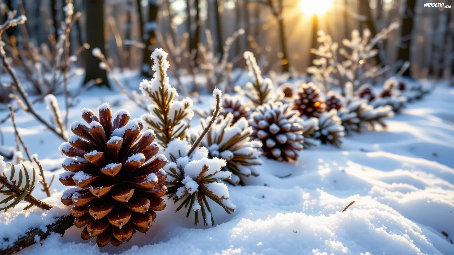 Zdjęcia, Zima, Las, Promienie słońca, Gałązki, Szyszki, Śnieg, Rośliny