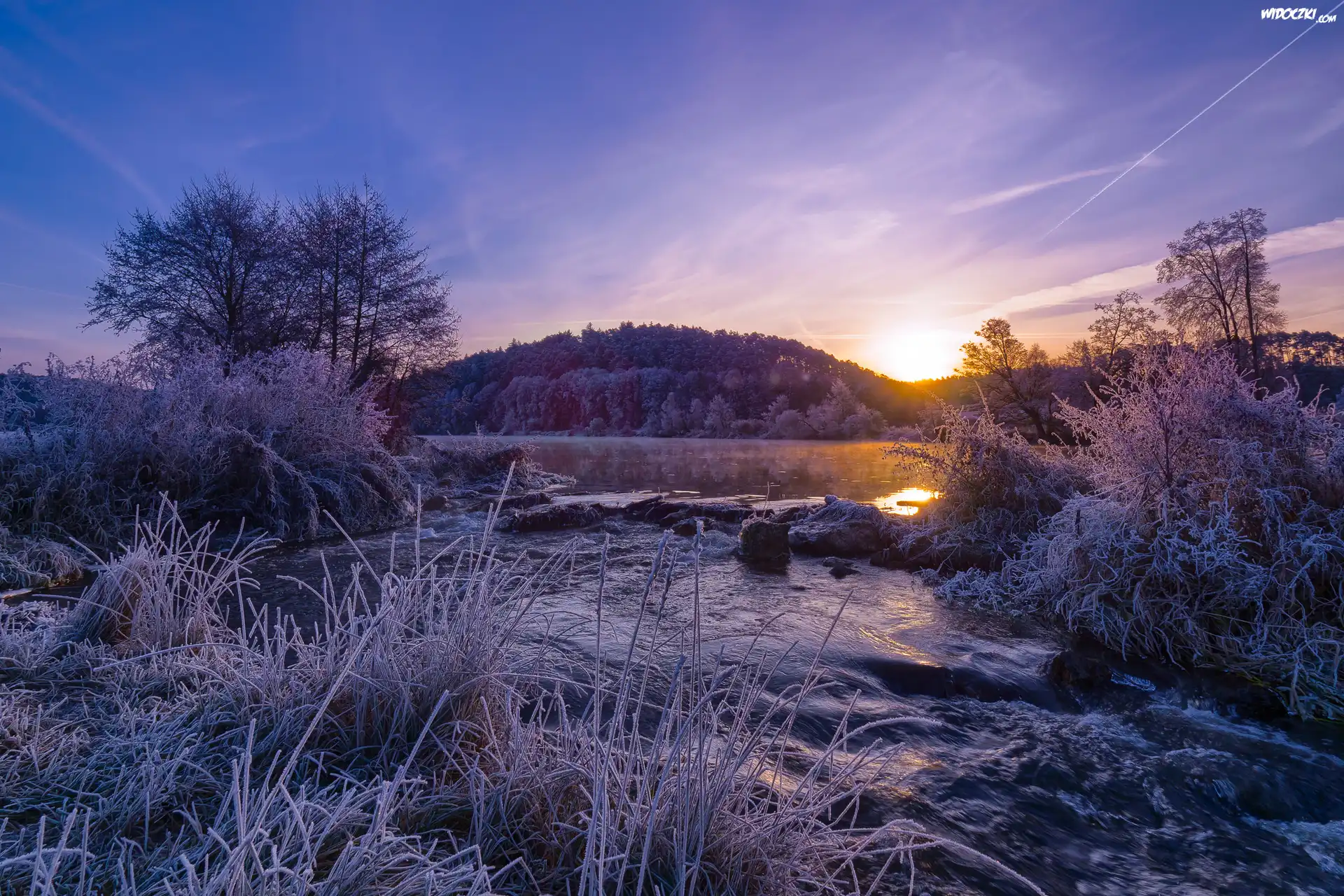 Przymrozek, Rzeka Naab, Oszronione, Drzewa, Rośliny, Wschód słońca, Powiat Schwandorf, Bawaria, Niemcy |