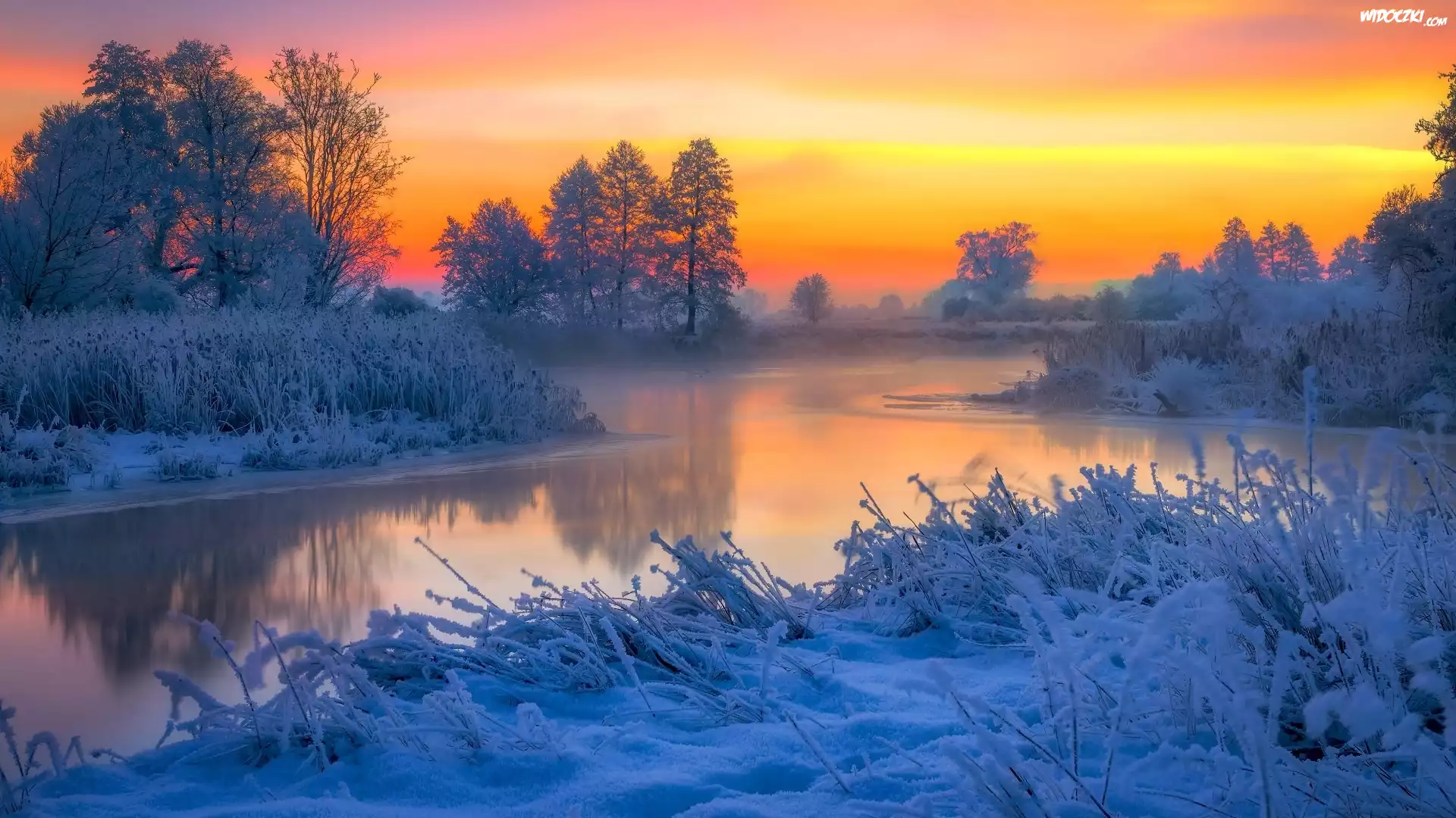 Zima, Wschód słońca, Rzeka, Ośnieżone, Drzewa, Ośnieżone, Rośliny