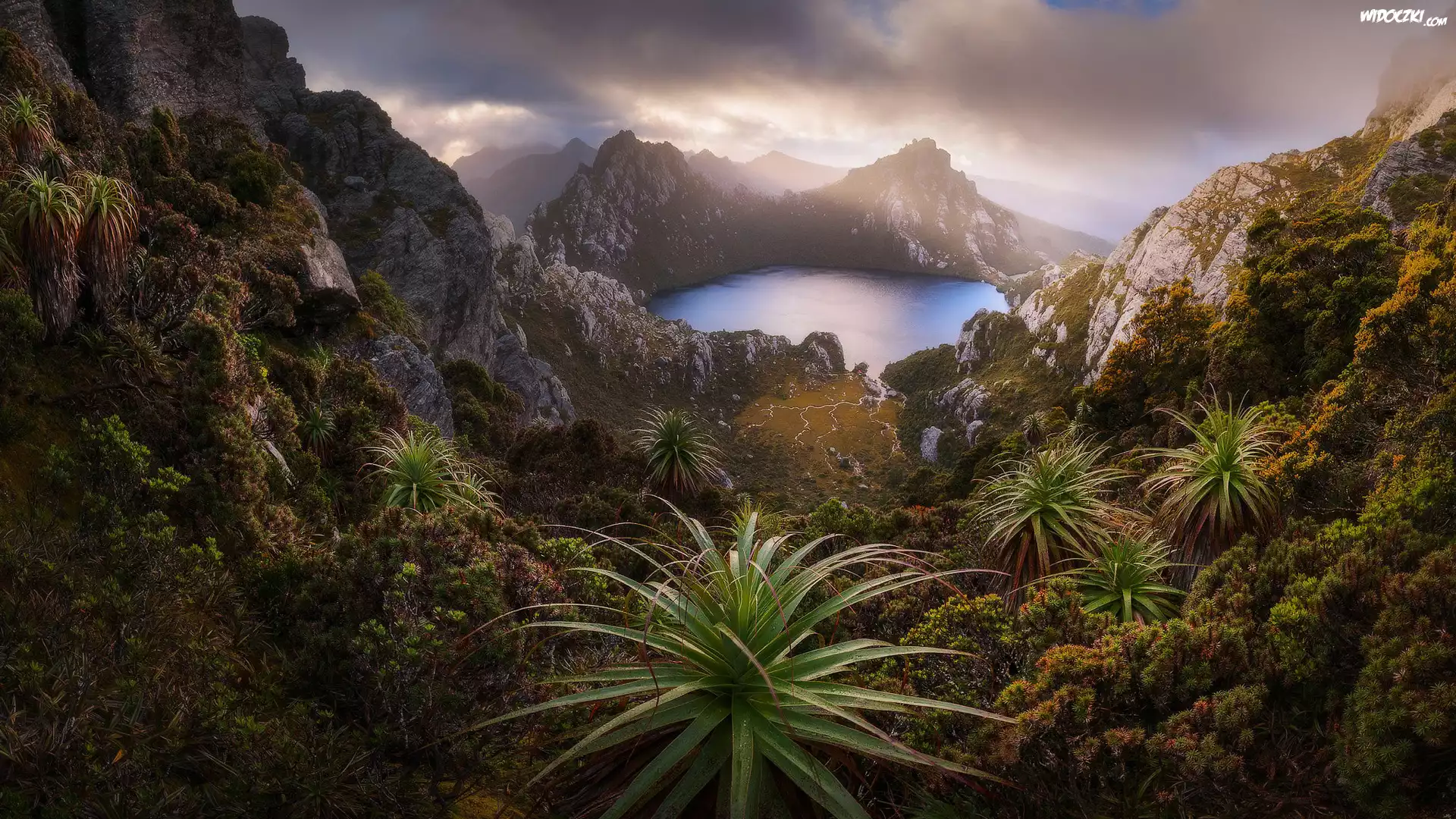 Zdjęcia, Australia, Tasmania, Park Narodowy Southwest, Góry, Skały, Jezioro Oberon, Rośliny