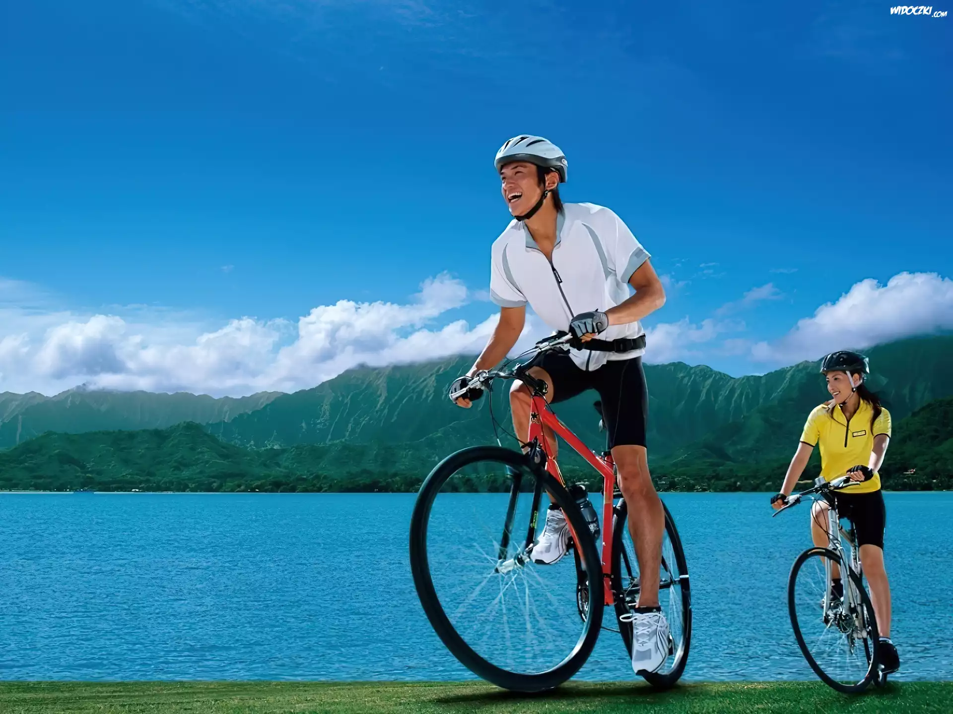 Rower, Jezioro,kask, koło