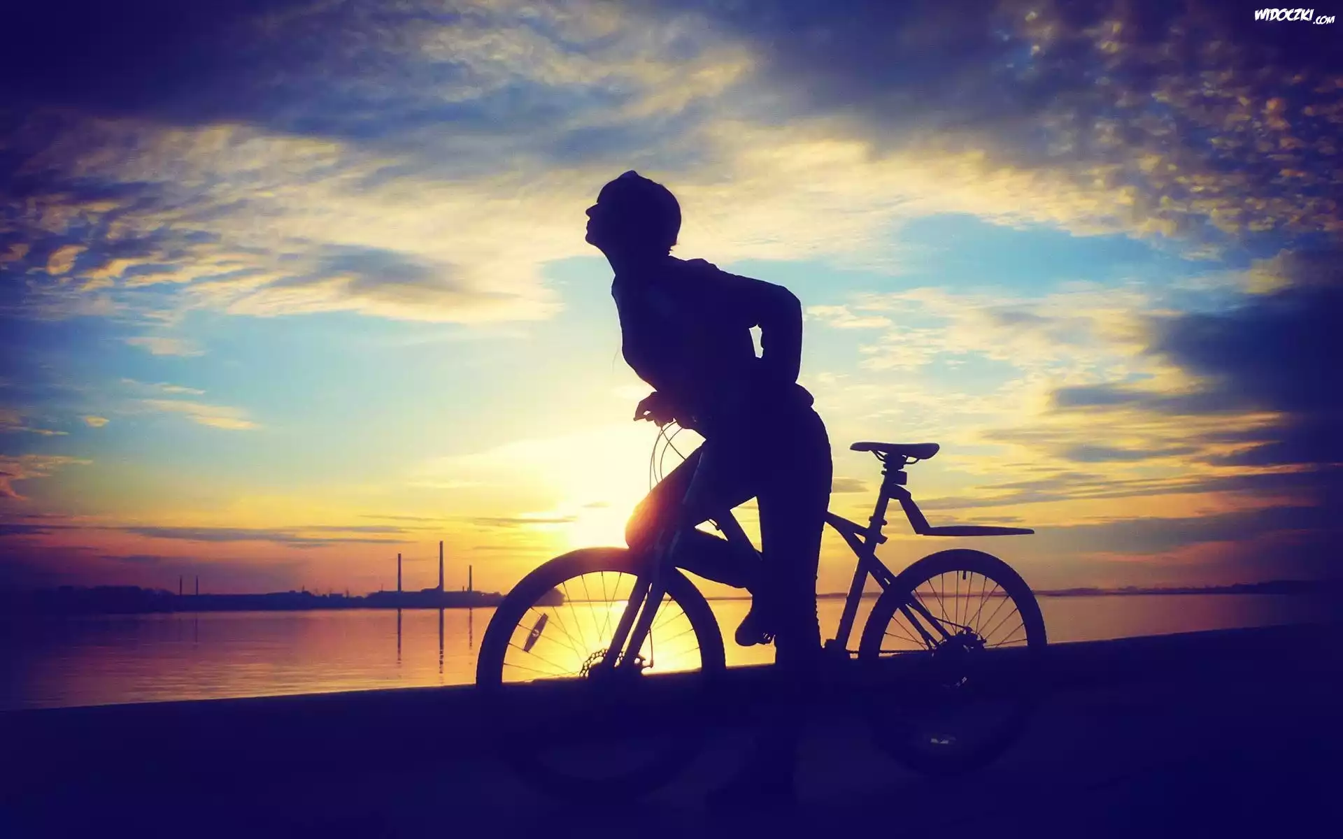 Zdjęcia, Rower, Jezioro, Zachód, Słońca, Kobieta