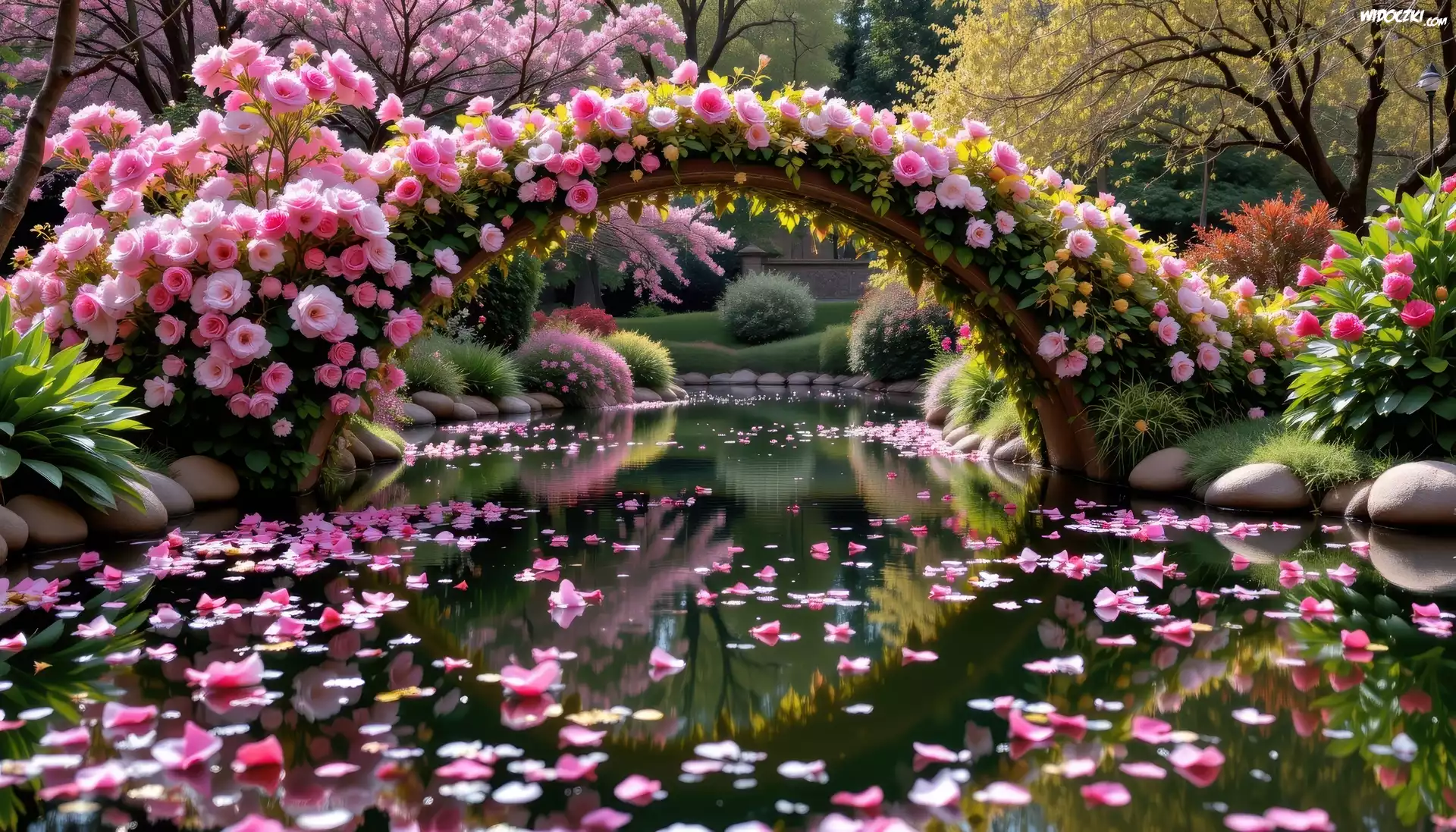Ogród, Mostek, Łuk, Róże, Różowe, Staw
